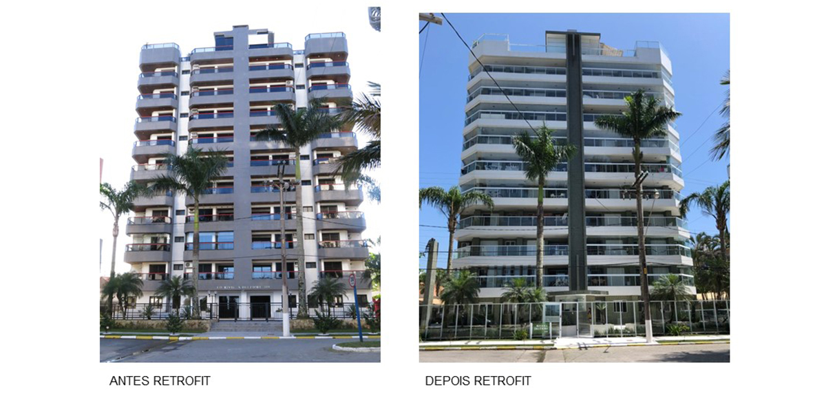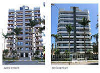 Empreendimento: Acrescentado 60m² de área de terraço por pavimento, troca de todas as esquadrias e revestimentos da fachada.